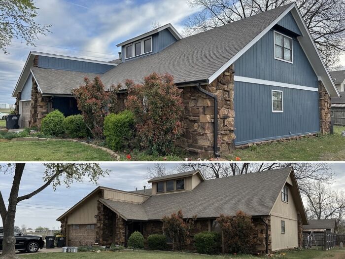 For the main color, a rich blue called Needlepoint Navy (SW0032) was selected. It’s a beautiful shade that makes the house stand out. Then, we added Snowbound (SW7004) for the trims—it’s a clean, crisp white that isn’t too stark and goes great with the blue and the house’s stone work. Before, the house was all different shades of brown and didn’t really catch your eye. Now, it’s got curb appeal.